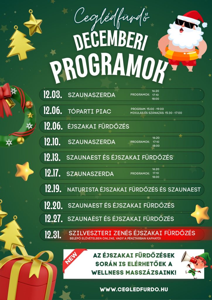 Összeszedtük nektek egy csokorba a Ceglédfürdő decemberi programjait, hogy előre meg tudjátok tervezni a feltöltődést, legyen szó egy lazító hétköznapról vagy egy élménydús hétvégéről!