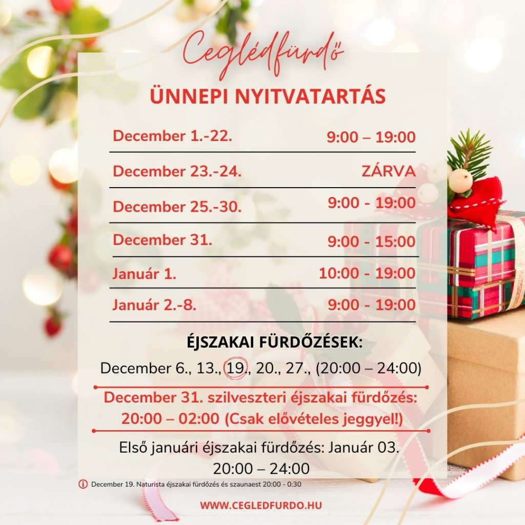 Az év legvarázslatosabb időszakában is szeretettel várunk Benneteket! Nézzétek meg ünnepi nyitvatartásunkat, és tervezzetek egy igazi pihentető fürdőzést!